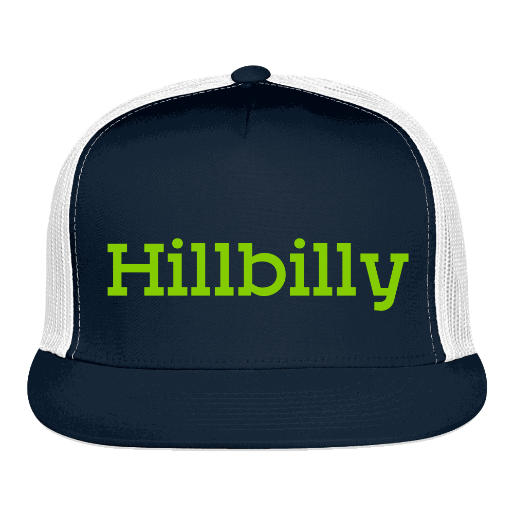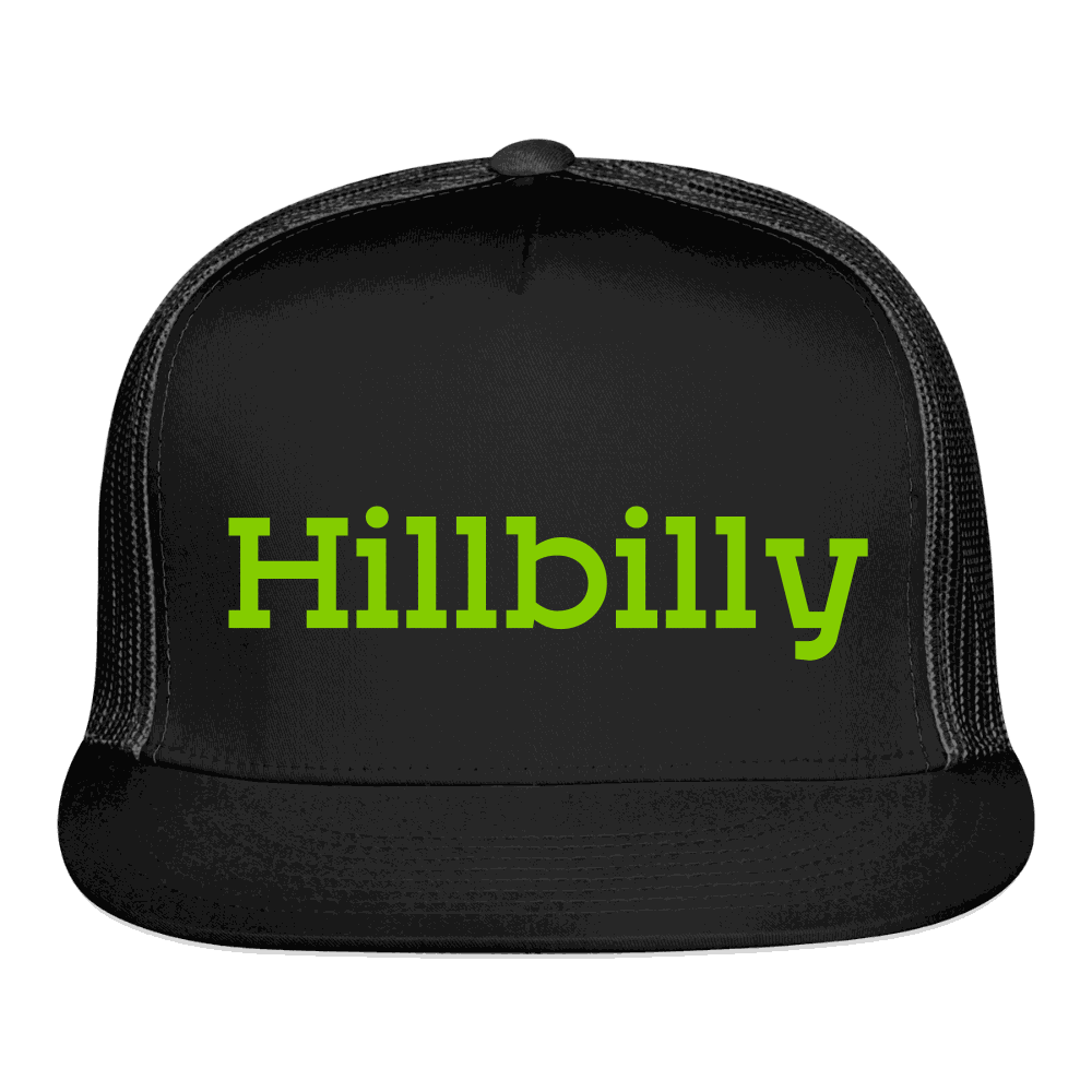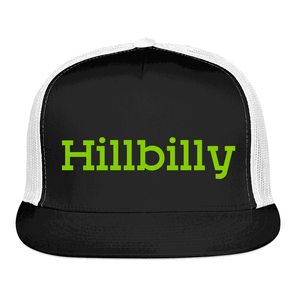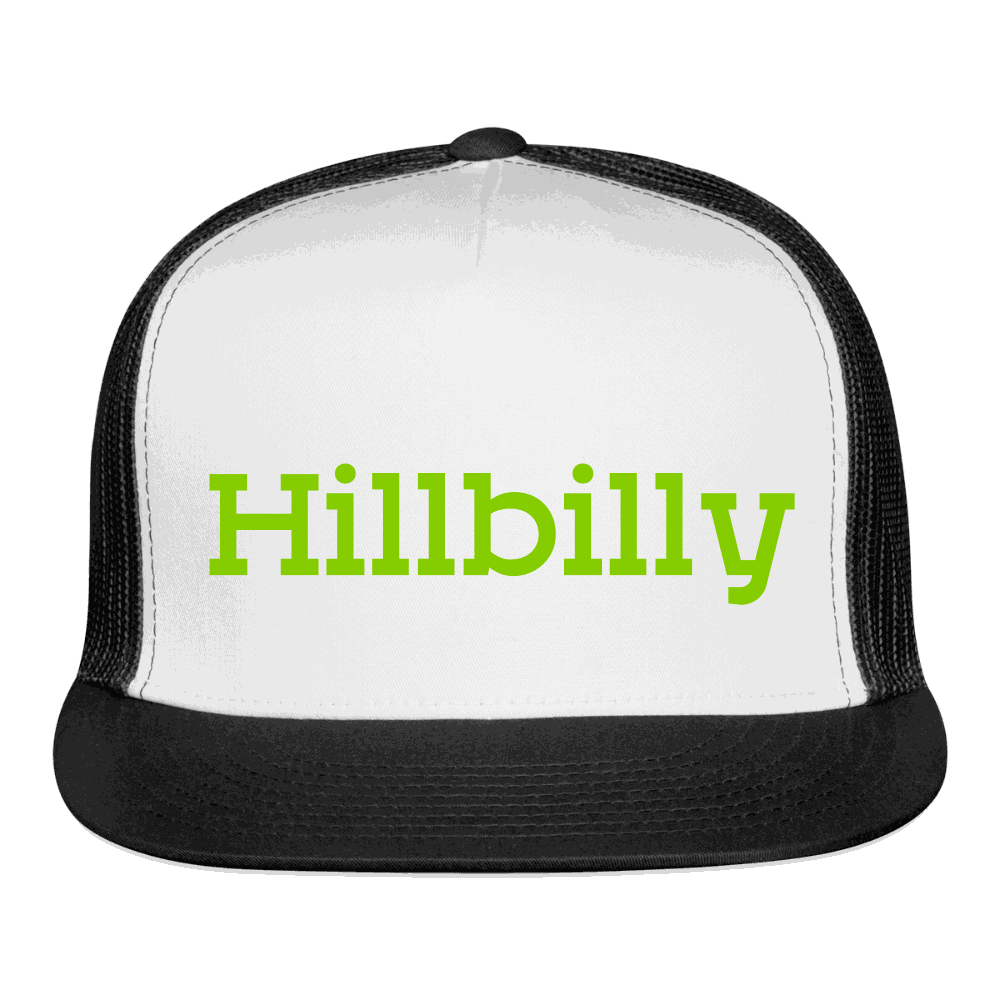 Black and white trucker hat with green "Hillbilly" text and snapback closure