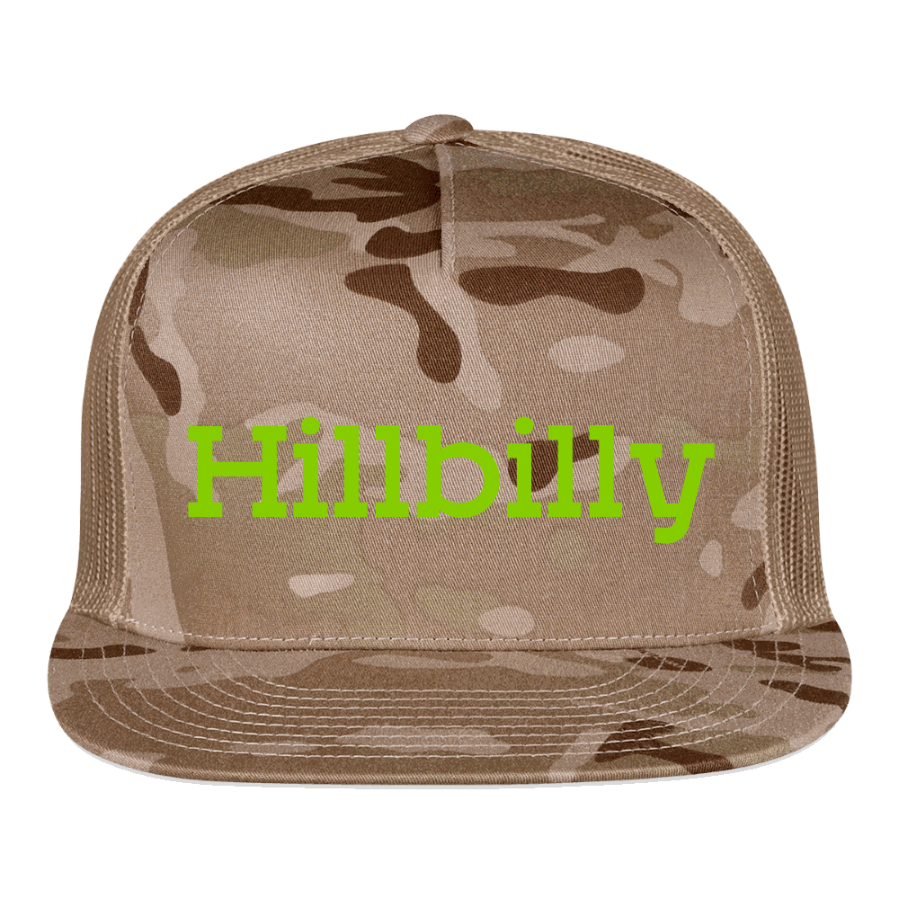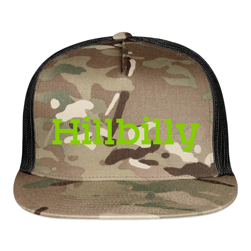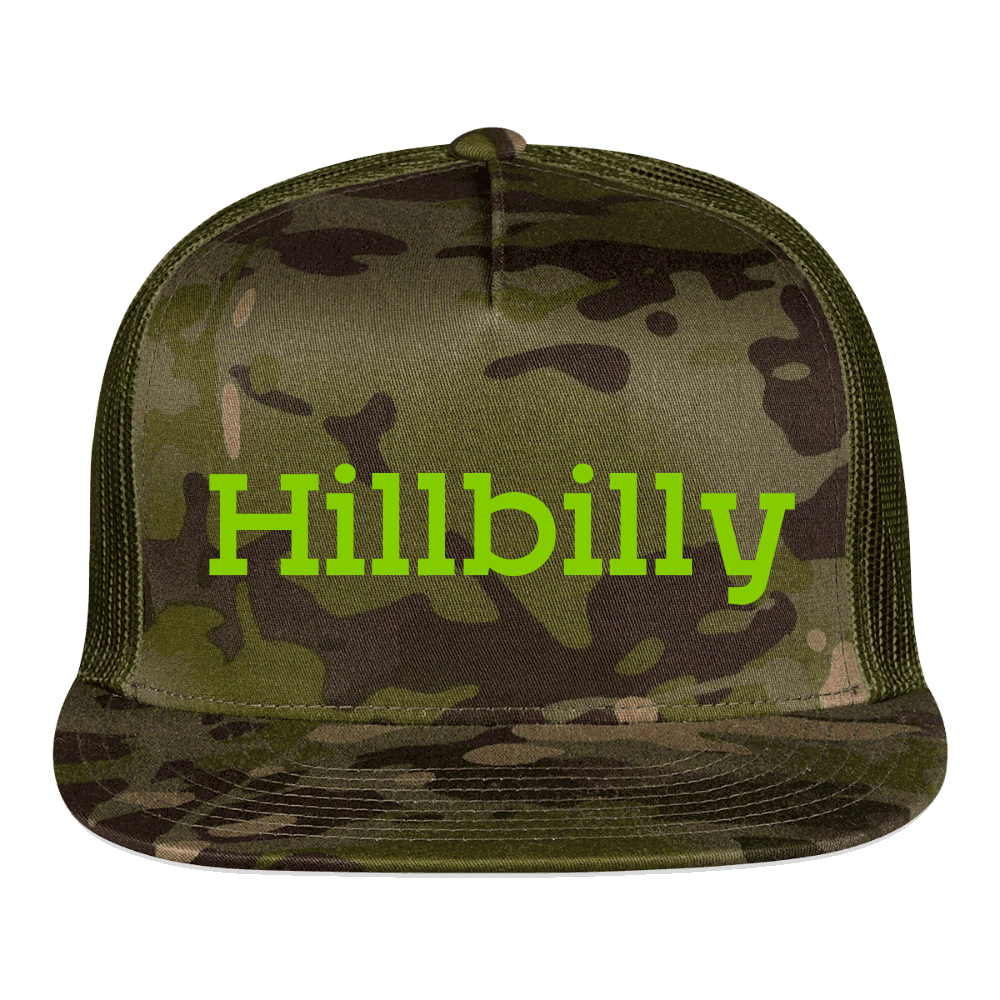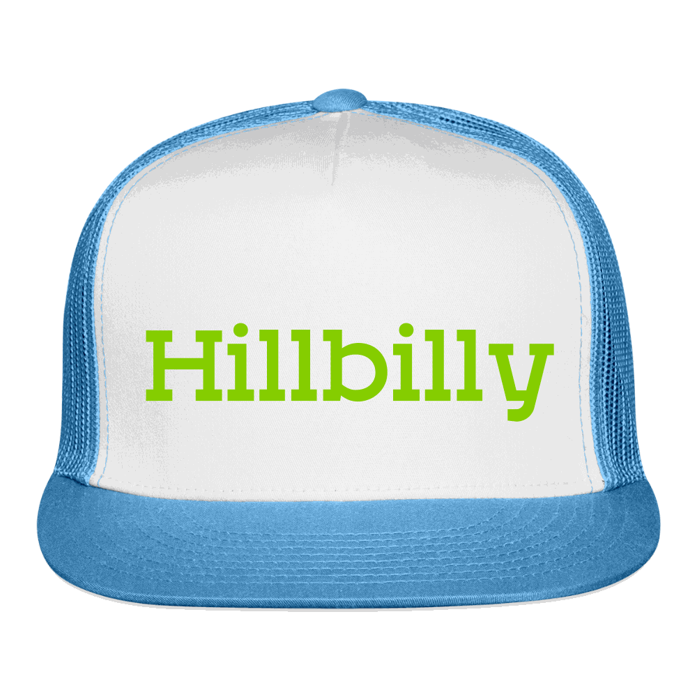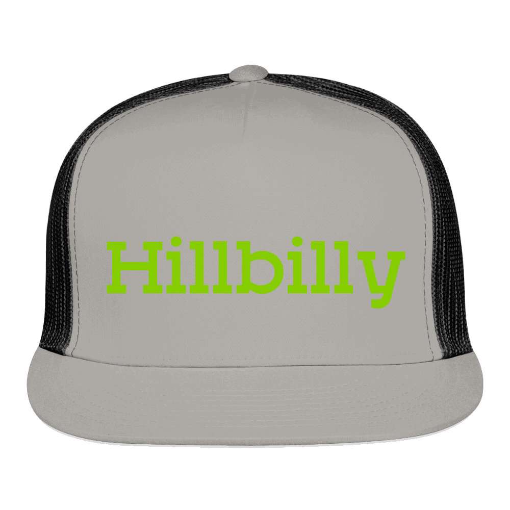 Black and white trucker hat with green "Hillbilly" text and snapback closure
